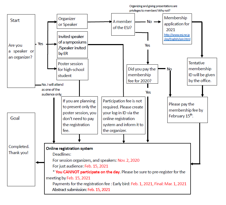 - It will be not possible to register on the days of ESJ68. Even if you will participate as an audience, please make sure to register as a participant by 23:59 (JST) on February 17, 2021(Wednesday).