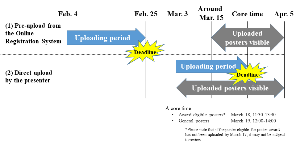 - Please create the poster file in PDF format without audio or video embedding. You can include links to videos, etc., in the PDF file. The file size should be 10MB or less. There are no particular specifications regarding the appearance of the poster file, such as aspect ratio or number of pages, but please try to make it so that the audience can understand the research content without any oral supplementary explanation. Please do not set a security password for the PDF. For other detailed notes on the poster file, please see here. There are two ways to upload the poster file: (1) pre-upload from the Online Registration System and (2) direct upload by the presenter to the portal site.。