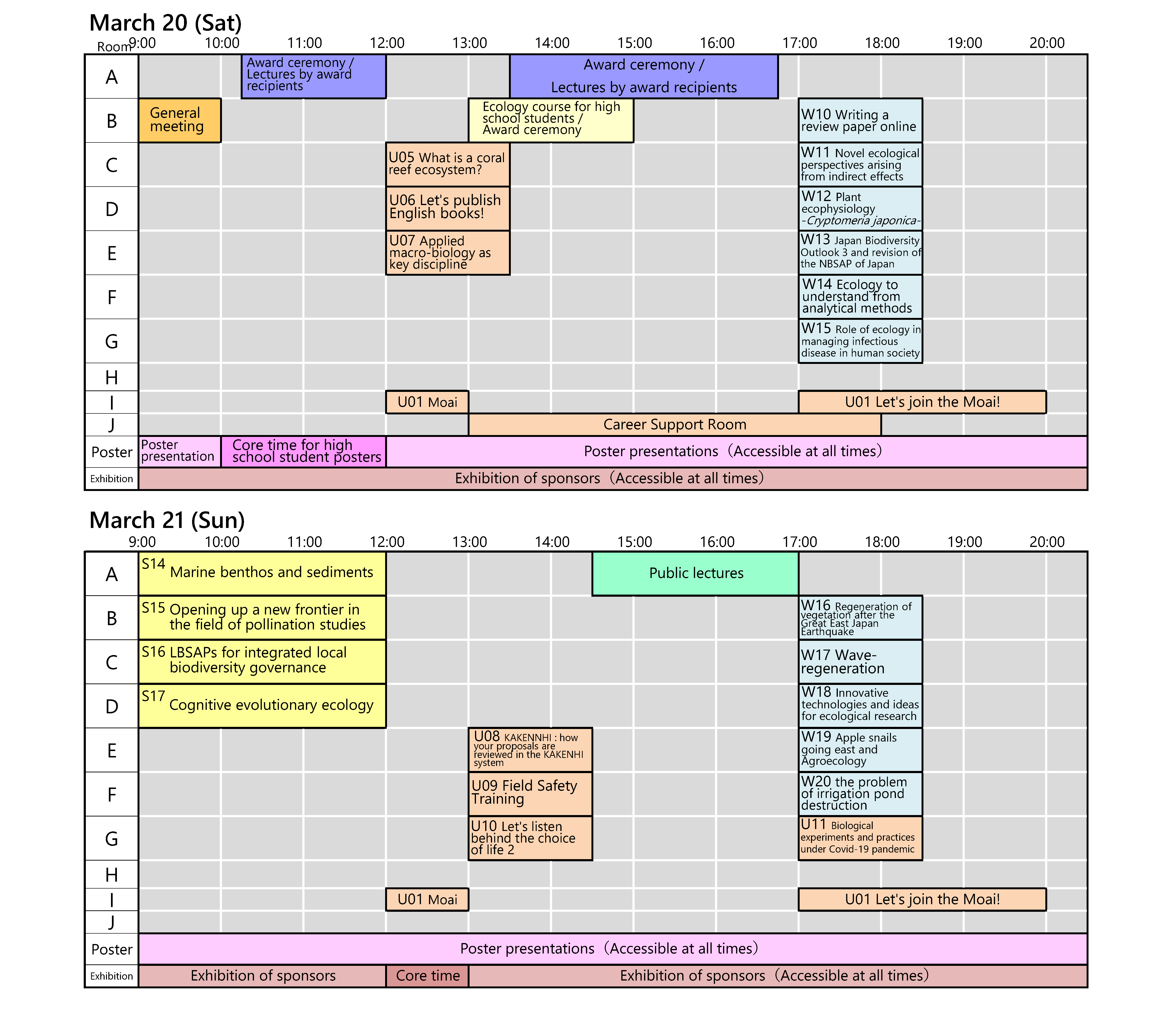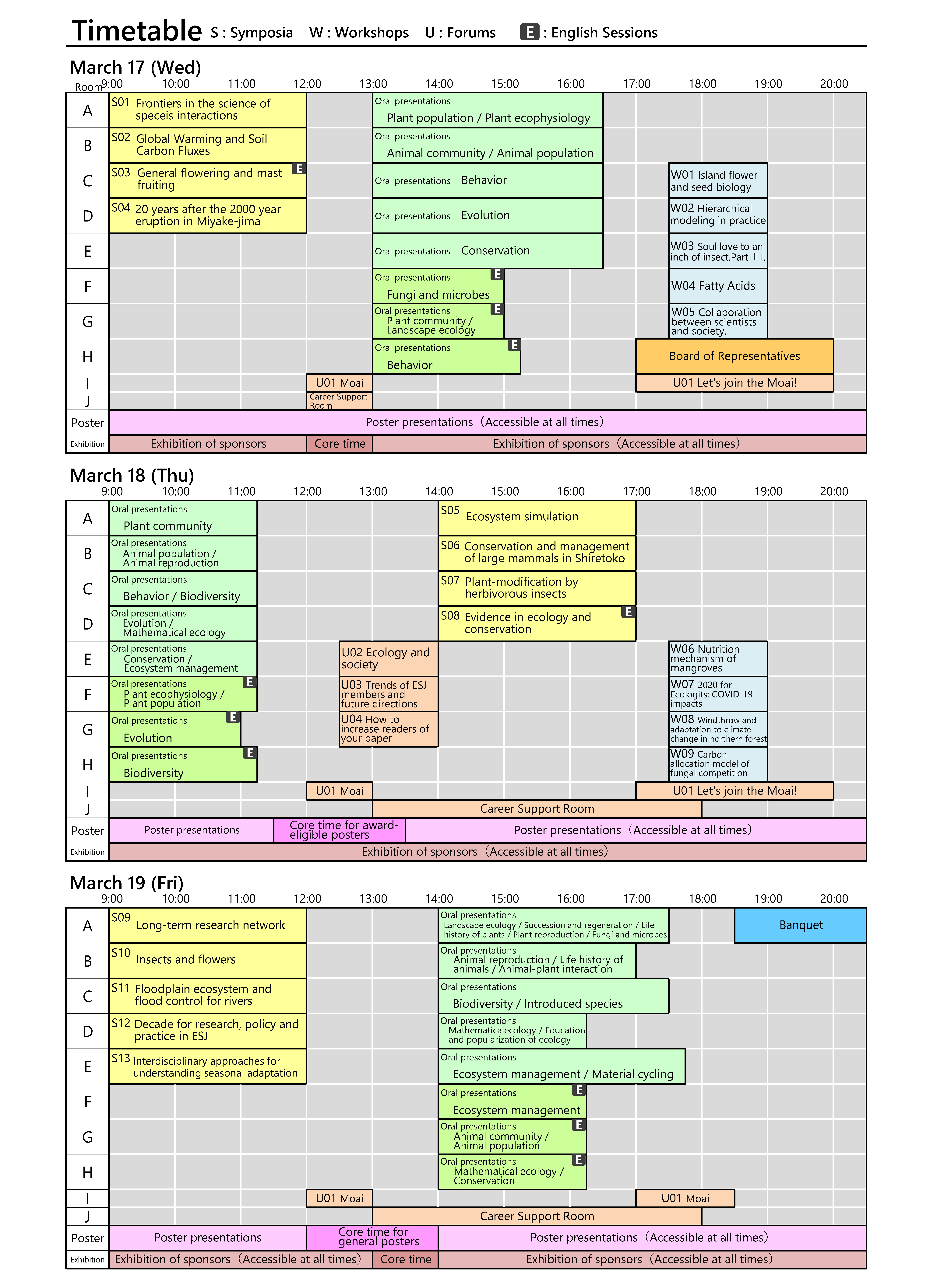 The following is timetable (PDF) of oral presentations on March 17 (Wed.), 18 (Thu.) and 19 (Fri.).