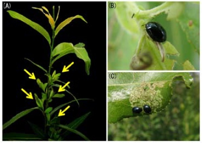 B 極端に新葉を好むヤナギルリハムシと C 葉齢への好みを持たないハムシ